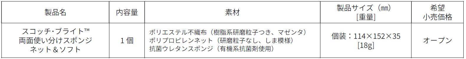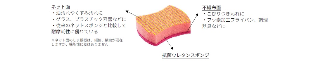 こうしたことから、貼り合わせソフトスポンジとネットスポンジの機能を兼ね備え、1つで異なる汚れをスッキリ落とせる便利なアイテムとして、本製品を発売します。